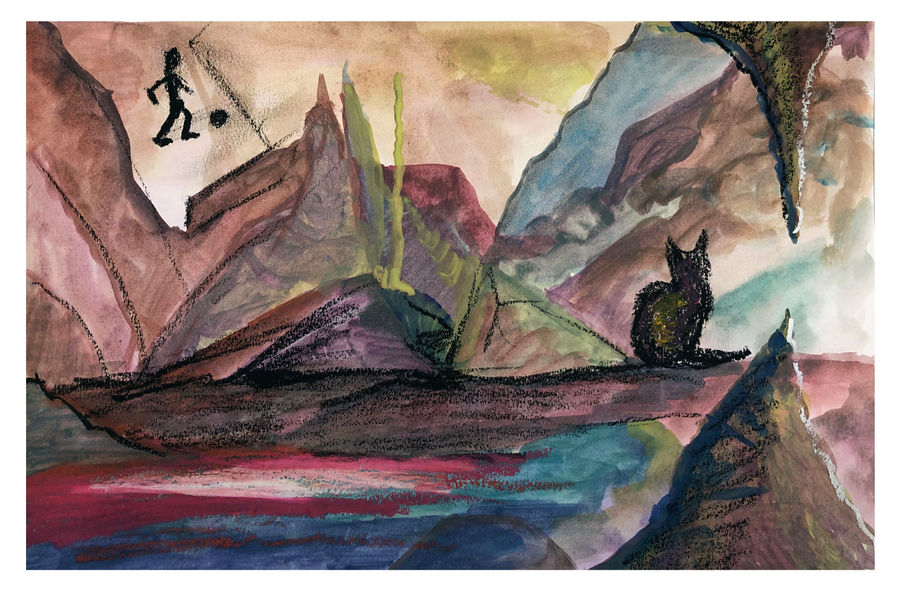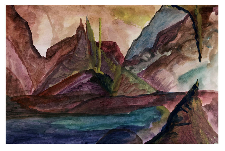 schilder het hele vlak met waterverf in verschillende kleuren en in verschillende mate van dekkingskracht (transparant- dekkend) tot een vlak dat de suggestie van een rotswand oproept;